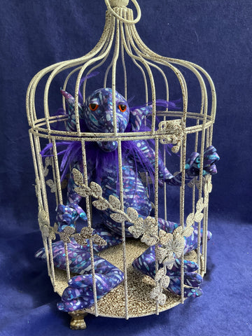 Each gremlin is made of cotton fabric, with inset eyes and an ostrich feather mane. The cage will vary, but is about 12" tall, with the gremlin sitting inside at about 8" tall. The large gremlin is about 14" tall and the cage is about 21" tall. Colors are available as shown; if you'd like a custom color gremlin, include your choice in a "Note to Seller" on the shopping cart page. Fabrics and cages will vary.