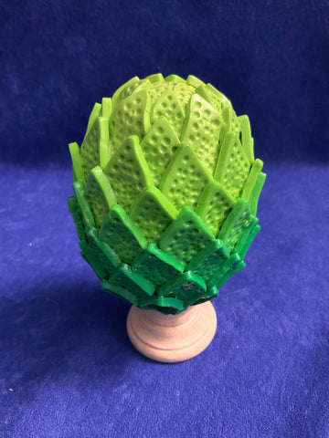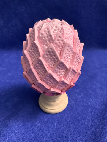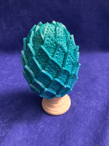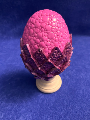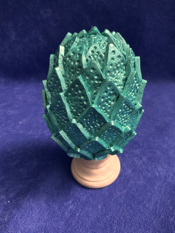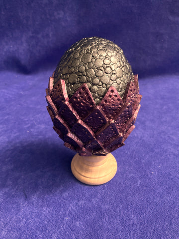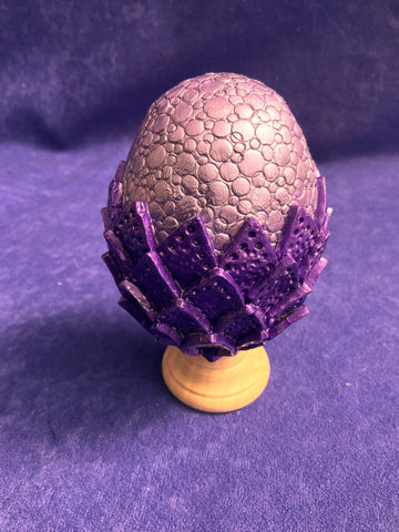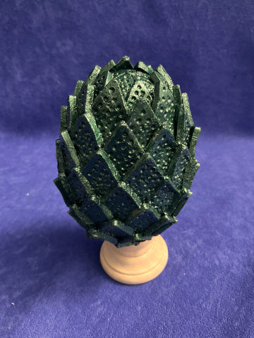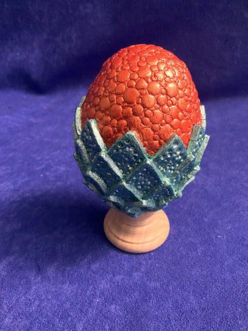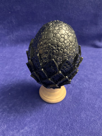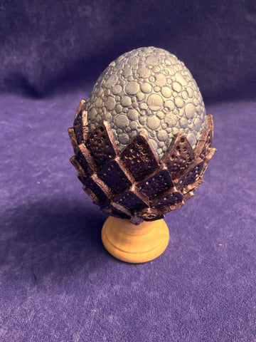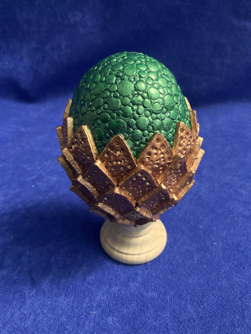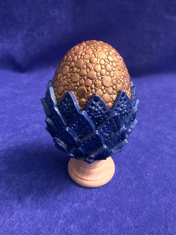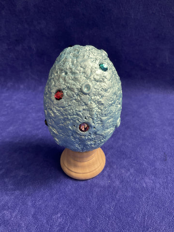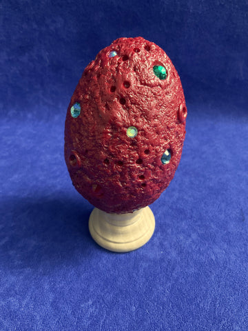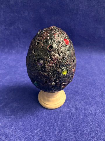 Dragon eggs are made of polymer clay over blown goose eggs. Embellishments include glitter and Swarovski crystals; and a protective coat of sealer is put on each egg. The eggs are about 3-1/2 inches tall, and available in jeweled, scaled, or half-scaled versions. An egg stand is included with each egg. While not fragile like glass, the baked clay can be chipped or broken if dropped, so caution is advised. Styles and colors are available as shown; if you'd like a custom-made egg, choose the "custom" option, and add a note about which style and color you'd like on the checkout page.